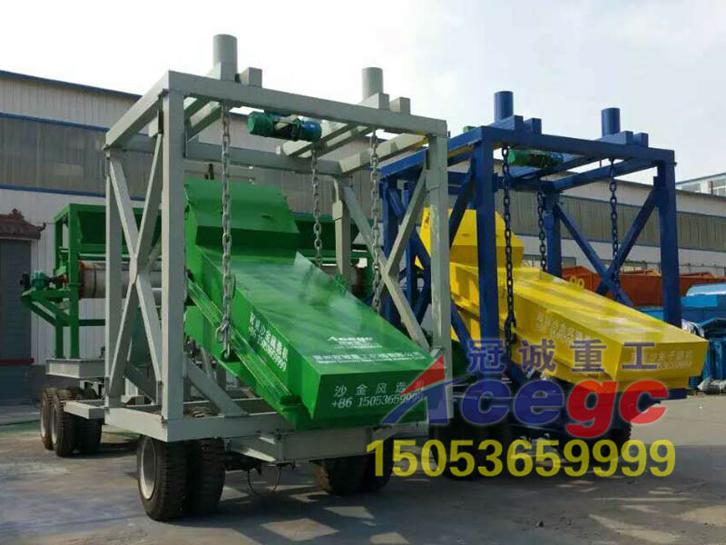 戈壁灘原礦重選機(jī)械主要是由其它工程機(jī)械喂料(如:裝載機(jī)、挖掘機(jī)),主要組成部件有1.喂料粗篩分 2.儲(chǔ)料倉(cāng) 3.給料機(jī) 4.上料輸送機(jī) 5.精篩分 6.旋風(fēng)選金床 7.強(qiáng)壓鼓風(fēng)機(jī) 8.可移動(dòng)整體機(jī)座 9.機(jī)械鼓動(dòng)系統(tǒng) 10.石料輸送機(jī) 11.電氣控制系統(tǒng),整體流程全為數(shù)控操作,只需一人。
